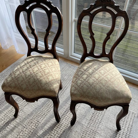 Trästolar med utskuret ryggstöd och dekorativa sitsar