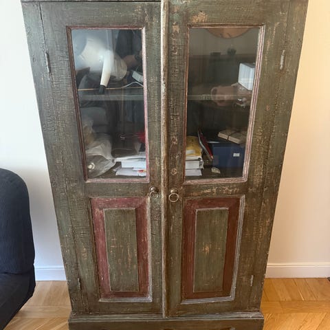 Blått träskåp med två dörrar och flera hyllplan inuti. Skåpet har en klassisk design och är målat i en ljusblå färg. Passar för förvaring i olika rum.