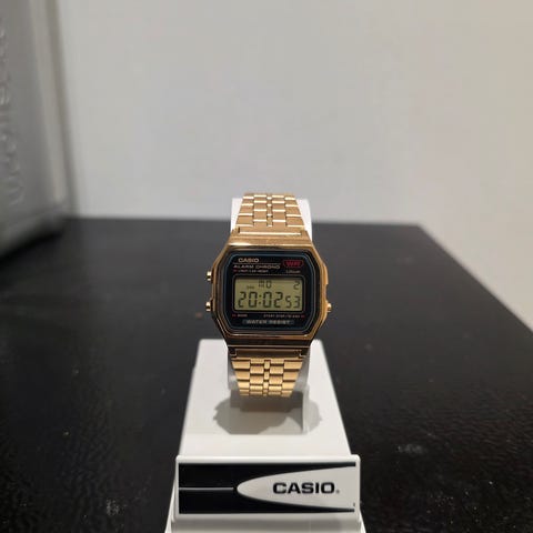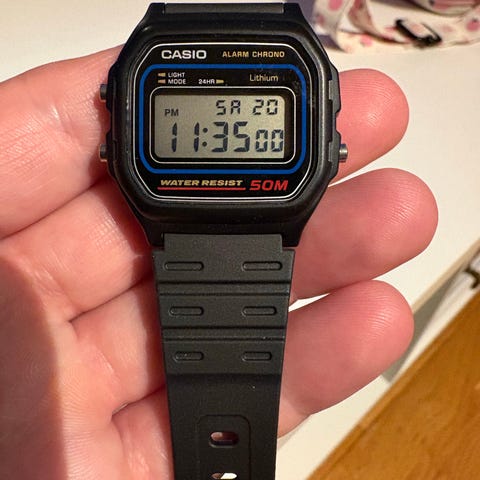 Casio F-91W digital klocka för unisex med svart plastarmband och rektangulär urtavla. Klockan har digital display med tid, datum och veckodag. Vattentålig och utrustad med funktioner som alarm och stoppur.