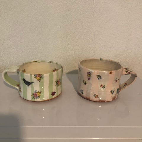 Keramik teservis med flera koppar, fat, tekanna och tillbehör. Servisen har dekorativa målade detaljer i olika färger och en naturlig keramisk yta. Passar för servering av te och som samlarobjekt.