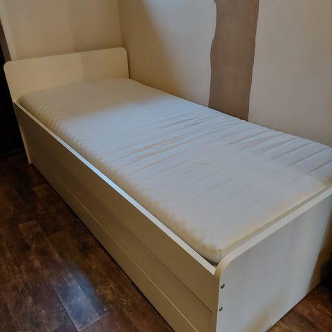 Säljer en IKEA SLÄKT säng 90x200 cm med förvaring, i vitt.