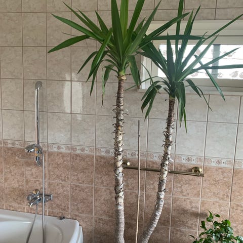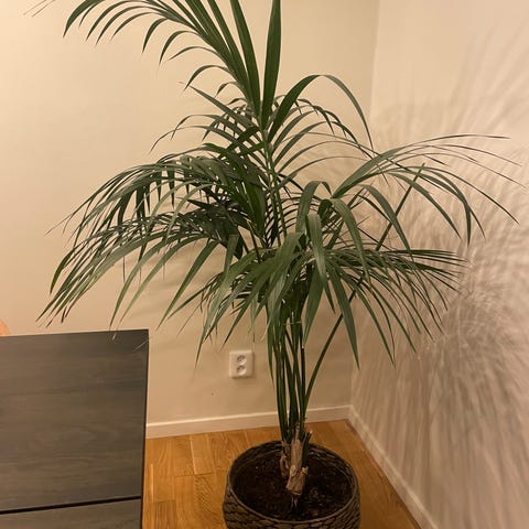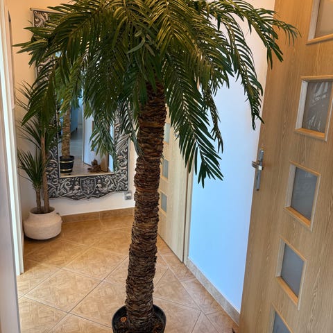 Set med tre konstgjorda palmväxter i svart kruka. Gröna plastblad och stjälkar. Passar som dekoration inomhus.