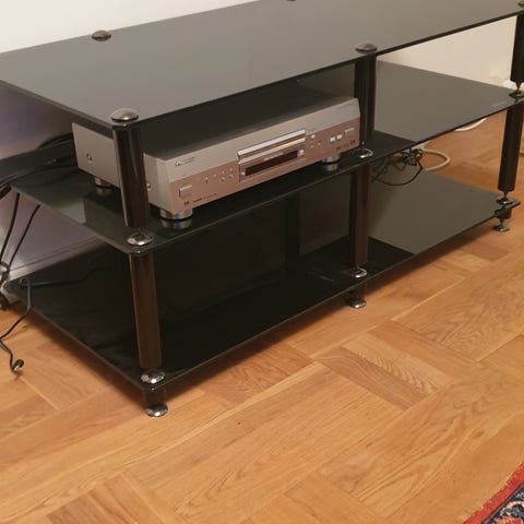 Information: Begagnat Hi-Fi-rack med 4 hyllplan, i gott skick med lite märken på hyllplanen.