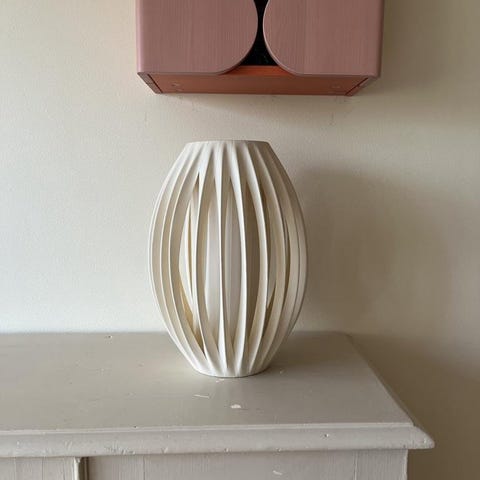 Handgjord vit blomlampskärm på stilren lampfot med liten glasdekoration.