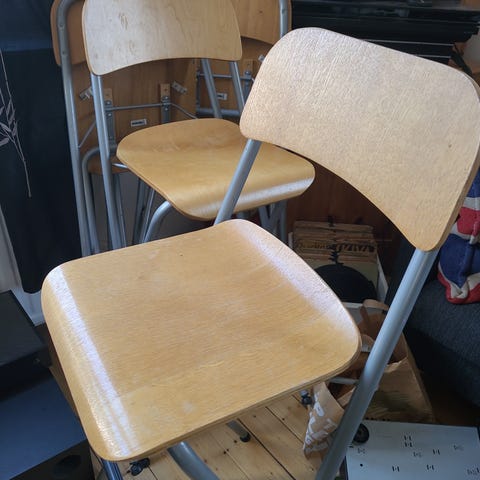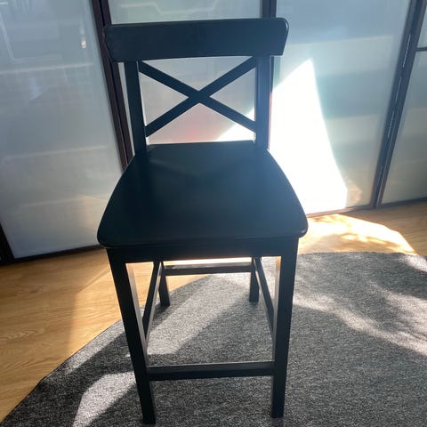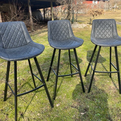 3 st barstolar med sittdyna i grått tyg och med metallklätt fotstöd (se bild). Sitthöjd 60 cm. Inköpta hos Möbelmästaren i Ronneby. 500 kr för alla tre.