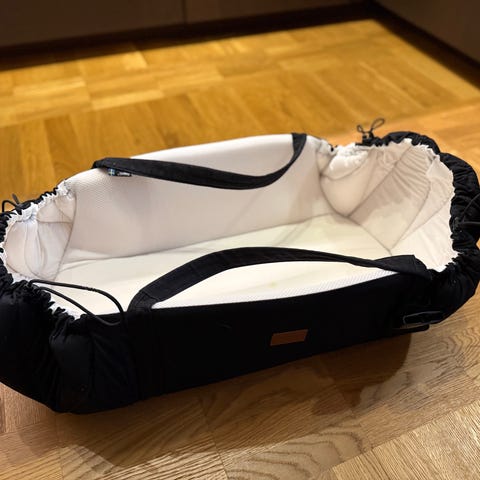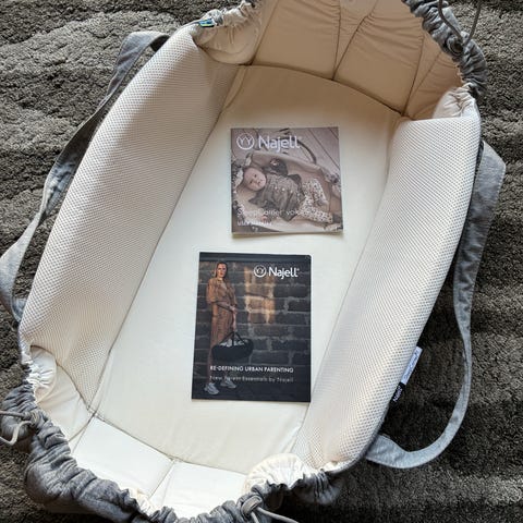Najell Sleepcarrier volume 2, i färgen Sandy Beige. Kan användas som babynest, bärsele och insats i barnvagn. Även ”fälla ut” för att fungera som lekmatta. Lätt och smidig att ta med.