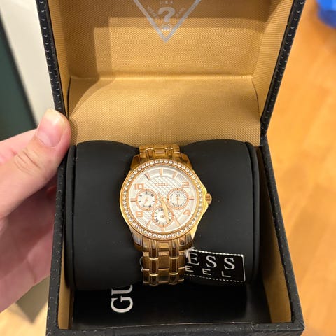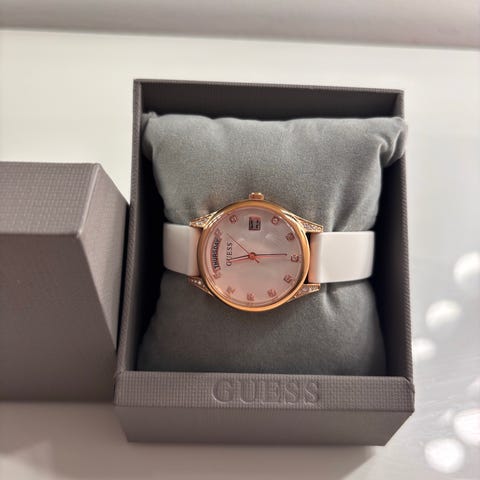 Helt ny & oanvänd Guess-klocka vunnen i auktion med rund urtavla och kronograf. Uret har en kombination av ljusa och roséguldsfärgade detaljer samt en ljus rem. Levereras i originalförpackning.