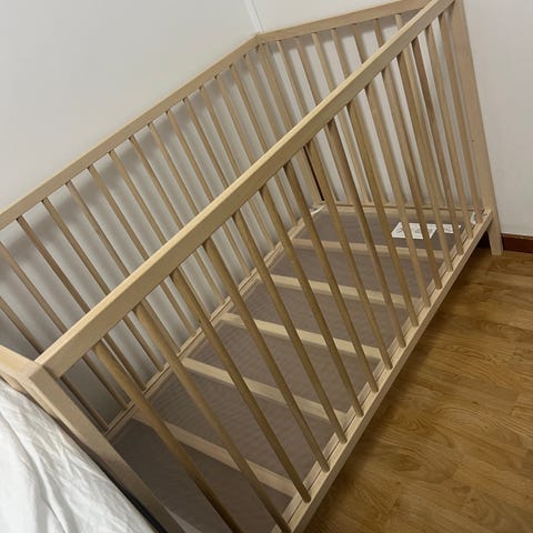 IKEA spjälsäng i trä med en enkel och funktionell design. Passar för små barn och erbjuder en säker sovplats. Sängen är i naturligt träutförande och har standardmått för spjälsängar.
