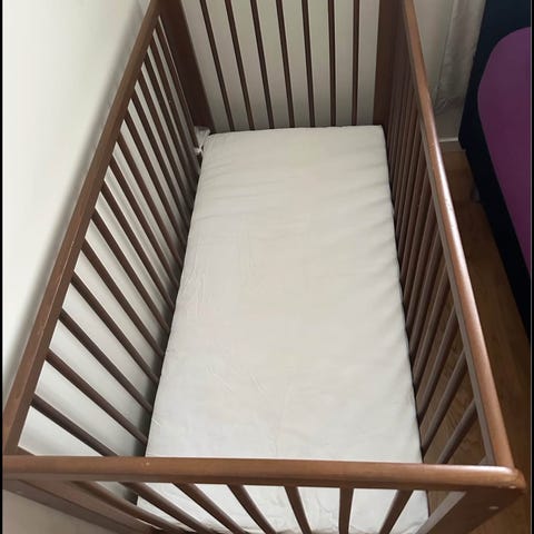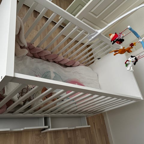 Vit spjälsäng i trä med spjälor på sidorna. Sängen är utformad för att ge säkerhet och stöd under barnets sömn.