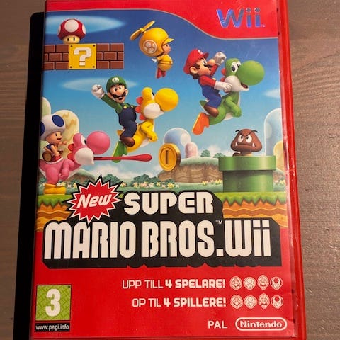Nintendo Wii New Super Mario Bros. Wii spel med originalfodral och skiva. Spelet tillhör Nintendo Wii-konsolen och är i standardstorlek för Wii-spel. Spelet är anpassat för alla åldrar och har flera spelare.