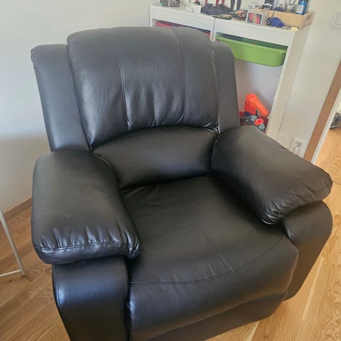 Perfekt för hemmabion! Reclinerfåtölj i svart konstläder. Fåtöljen är sliten i dynan så där är ett litet hål men jag har satt en repationlapp över hela sittdynan. Fåtöljen är skön att sitta i och fullt fungerande.