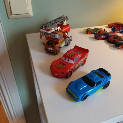 Stor Blixten McQueen bil i metall med frihjul och öppningsbar motorhuv. Mäter 20 cm i längd vilket i modellbilssammanhang kan översättas till skala 1:24.