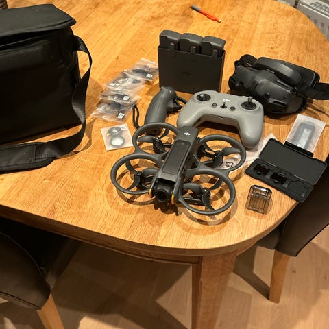 DJI FPV Avata 2 med motion controller 3 och dji fpv goggles n3. Den har ett batteri och har fyra extra propellerar.