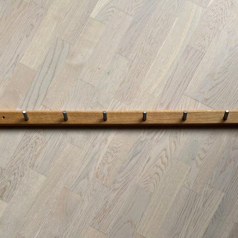 Essem kroklist i Ek med matta svarta skolkrokar. Mått: 90x9,3x15 cm (BxDxH). Ser i princip oanvända ut.