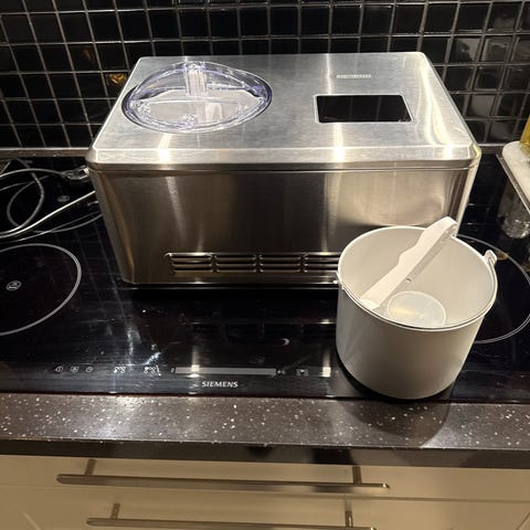 Nemox Gelatissimo Exclusive glassmaskin med transparent lock och kontrollpanel med knappar. Maskinen är designad för att göra gelato och glass hemma eller i mindre verksamheter.