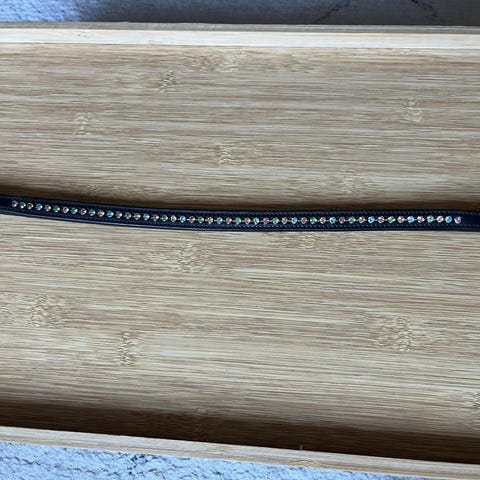 Pannband för häst med dekorativa kristaller i olika färger och mönster. Tillverkat i svart material med blanka stenar som pryder ytan. Används som en del av hästens träns för att ge ett estetiskt tillskott. Säljes var för sig eller köp alla tre för 300 kr.