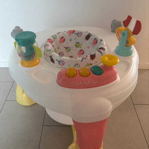Inköpt 2025 använt sparsamt till ett barn. Toppen för att öka stabilitet och första steg inför att lära gå. Barnet kan rotera i sittdelen så de själva kan välja vilken leksak de vill ha. När de är stora medföljer en platta för att göra om till leksaksbord.