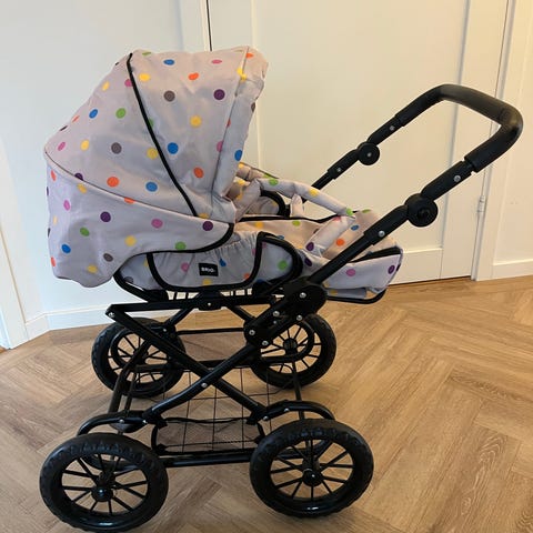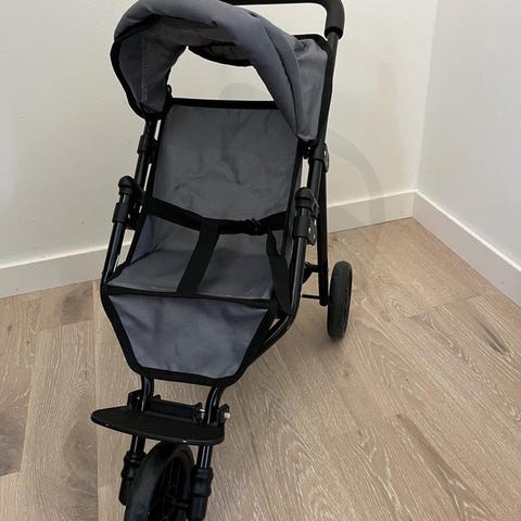 Cobi dockvagn med tillhörande bilstol och väska i grått tyg. Dockvagnen har en ram med hjul och handtag, samt en förvaringskorg under vagnen. Bilstolen är avtagbar och passar för dockor. Väskan har ett tryck med en krona och kan fästas på vagnen.