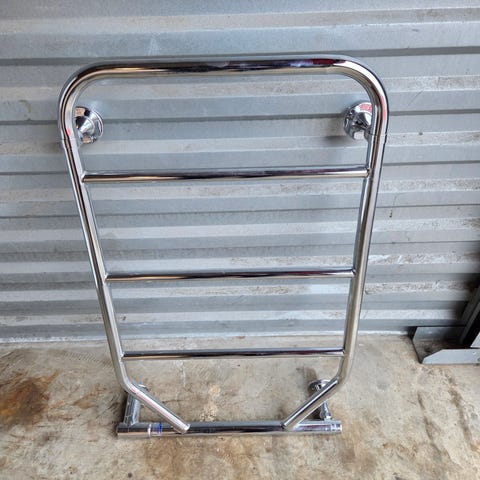 Elektrisk handdukstork i kromfärgat material. Monteras på vägg och används för att värma handdukar. Har flera rör för effektiv uppvärmning.