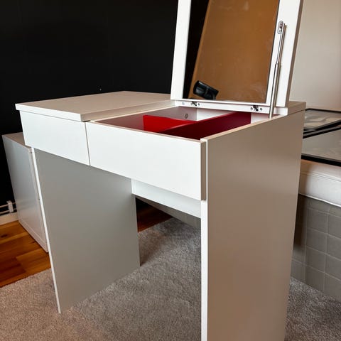 Sminkbord från ikea (Brimnes) med spegel och förvaring. Extra förvaring för t.ex hårprodukter och hårtork monterat på sidan.