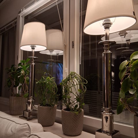 Två lampor som passar till såväl bord som till fönster. Stilren svart textil.