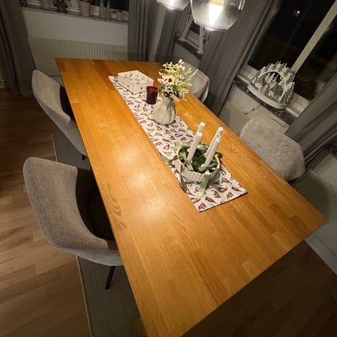 Matbord i massiv ek. Mått 85*180 cm hög 78 cm.