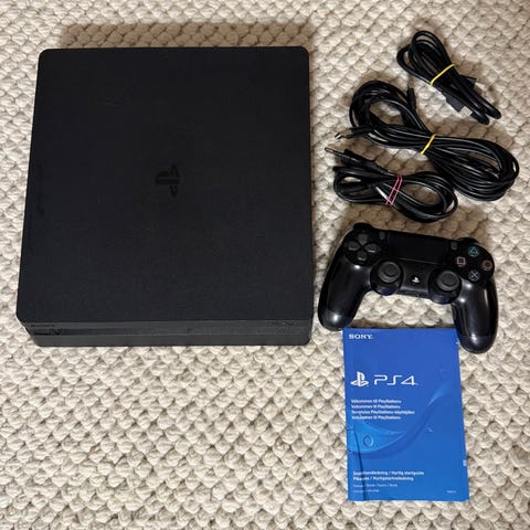 Sony PlayStation 4 spelkonsol inklusive handkontroll och användarmanualer. Konsolen är svart och har standardanslutningar för HDMI, USB och strömförsörjning. Systemet är inställt för flera språkval vid uppstart. Säljes utan strömkabel. Ny kostar inte många kronor på NetOnNet.