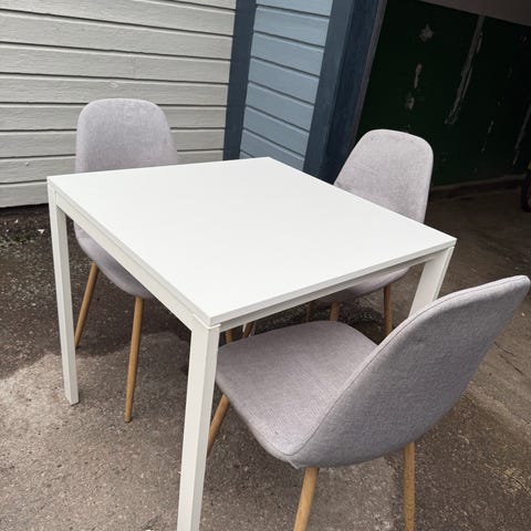 SäljarDet säljer 3 stolar +ett bord. Allt kostar 300kr. Vi skruvar av benen vid bordet