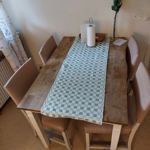 Matbord i vitt med kromade ben. Bordet är rektangulärt och har plats för fyra stolar. Mindre skador finns på bordets yta och kanter. Perfekt för en student.