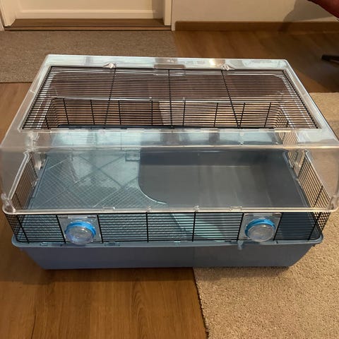 Hamster med bur och tillbehör inklusive hjul och spån. Djuret har ljus päls med mörkare partier. Bur av metall och plast med ventilationsöppningar. Passar som husdjur. 9 veckor gammal och det är en kille. Jag säljer han för att jag är tyvärr nästan aldrig hemma. Så det blir svårt att ta hand om den.