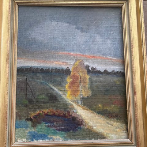 Oidentifierad oljemålning med motiv av en stadsscen. Målningen är inramad i en träram med mörk finish. Tavlan visar detaljerade byggnader och en gatumiljö.