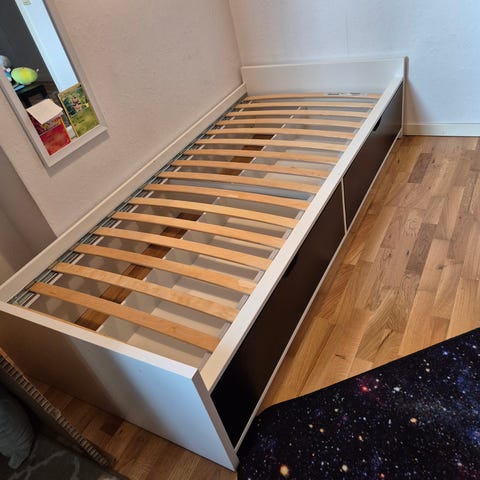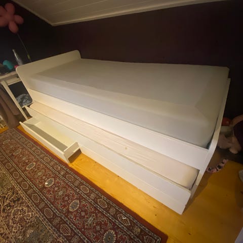 Säng med en säng under som man kan dra ut, även två förvaringslådor.