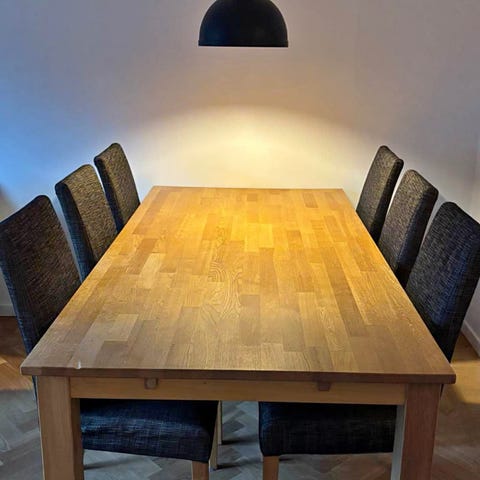 Matbord i ek-liknande material. Varsamt använt. Passar fint i en mindre lägenhet med plats för 4 personer.