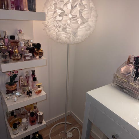 IKEA golvlampa med vit finish och justerbar arm. Passar för allmän belysning i vardagsrum eller arbetsrum. Enkel design som kan anpassas för riktat ljus.
