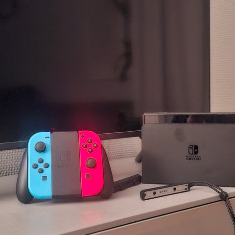 Nintendo Switch med vita Joy-Con-kontroller med tillhörande straps.