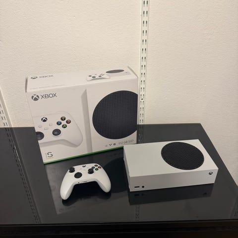 Xbox Series Xbox Series S spelkonsol i vit färg. Konsolen levereras med två trådlösa handkontroller och nödvändiga kablar för anslutning.