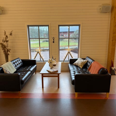 Använts med överdrag då skinnet är något slitet. Två tillhörande fåtöljer kan medfölja. Nypris 23 500 kr.