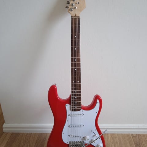 Elgitarr med sunburst-finish fram och div symboler inristade på baksidan, HSS-pickuper och limmad & skruvad hals. Tremolokaviteten pluggad - hardtail. Passar för olika musikstilar och en gitarrist som söker en gitarr som hen blir helt ensam om. Present? kanske?