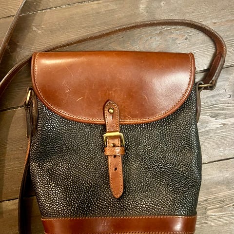 Väskan är tillverkad i läder och har en frontficka och innerficka med låsdetalj i metall samt en justerbar axelrem med metallspännen. Väskan är välvårdad och äkthetsbekräftad. Fler bilder kan skickas.