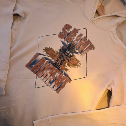 Saint Laurent M Hoodie i blå färg, tillverkad av bomull. Designad för herrar med standardstorlek M. Plagget har huva och frontficka, lämpligt för vardagligt bruk.