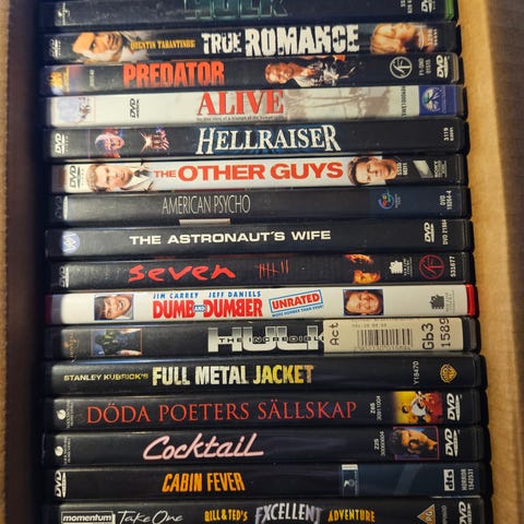 En samling av DVD-filmer med olika titlar inklusive The Lost Boys, Pet Sematary Two, Runaway Train, Mindhunters, The Stand, Expert, Haunting, Basic Instinct (VHS) och andra. Filmerna är av olika genrer och kan vara av intresse för filmälskare.