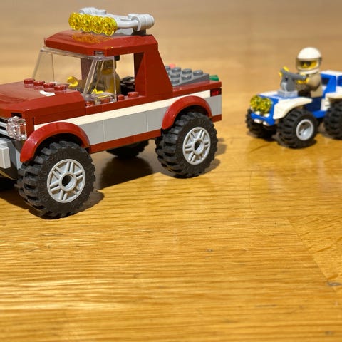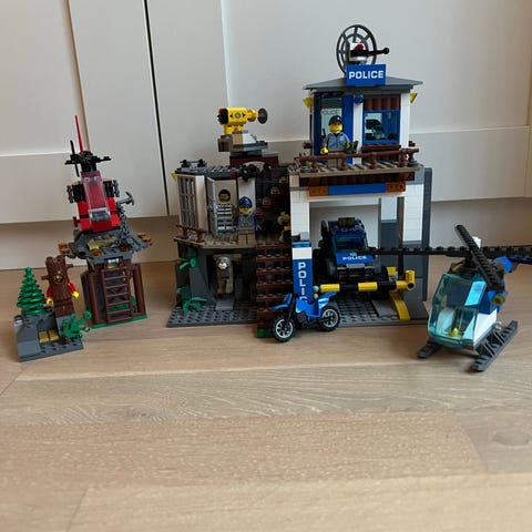 Lego City set 60172 Bergsjakt innehåller en polisbil, en röd terrängbil, en motorcykel. Inkluderar även en nätfälla, en sten, en varningsskylt och en liten bit av ett bergslandskap. Perfekt set för att leka tjuv och polis, med tre minifigurer.