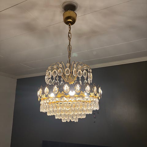 Fint äldre kristallkrona I mässing som är i bra skick och komplett.