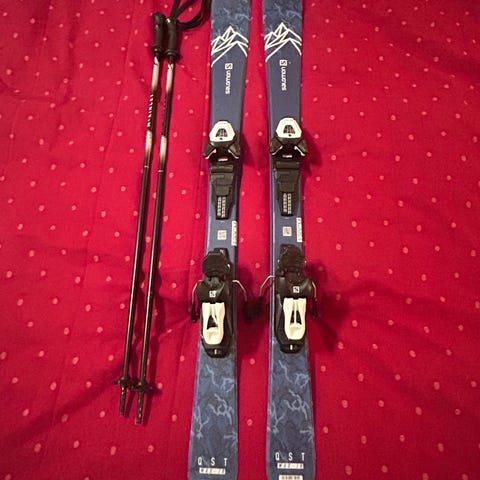 Välfungerande slalomutrustning för barn. Skidor 120 cm. Pjäxorna har ett innermått på ca. 23 cm.