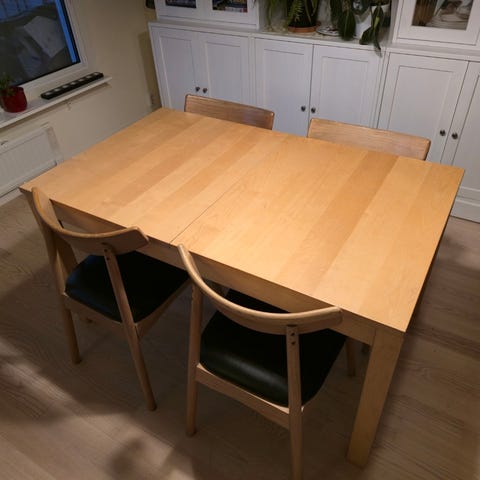 Bord i trä med tillhörande 4 ikea stolar. Bordet har en rektangulär form och är förlängningsbart med en extra skiva. Stolarna har trästomme och sitsar med färgglada mönster. Passar för matplats eller kök.