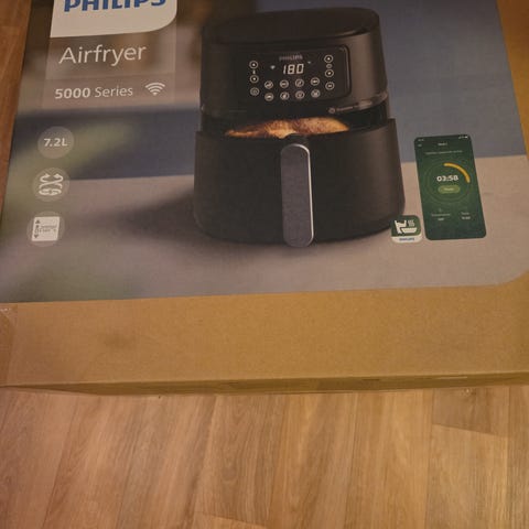Philips 5000 Series Airfryer med en kapacitet på 7.2 liter och svart färg. Luftfritösen har digital kontrollpanel och Wi-Fi-anslutning för smart användning.