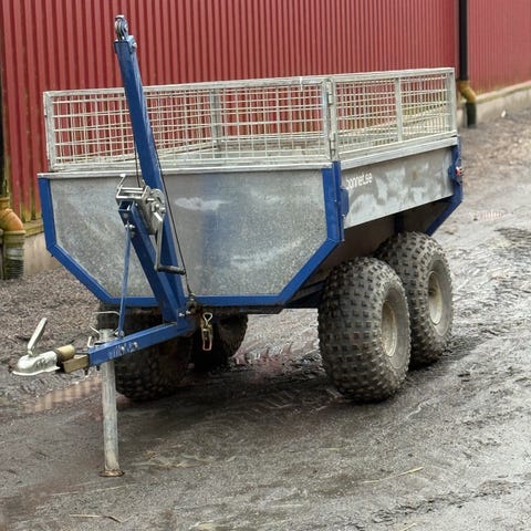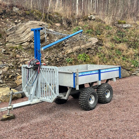 Skogsvagn utrustad med kran och stora hjul för terrängkörning. Vagnen har en robust metallram och används för transport av stockar och annat skogsmaterial.