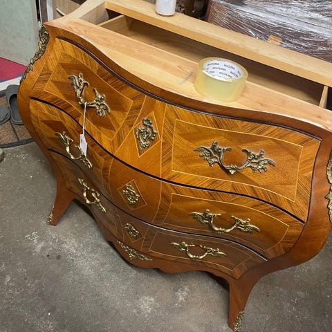 Byrån är i mörkbetsat trä (troligen furu) och har fina beslag i mässing. Den har två mindre lådor överst och två rymliga lådor nertill – sväljer massor av vantar, nycklar och småsaker.