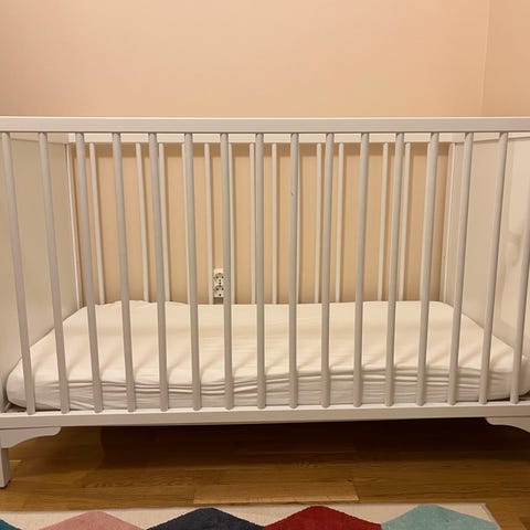 Spjälsäng i trä med en hjärtdetalj på huvudändan. Sängen har en naturlig träfärg och är utrustad med en lamellbotten. Passar för spädbarn och småbarn. Inkluderar även olika textilier såsom påslakan, madrassöverdrag, täcke, kuddar etc,