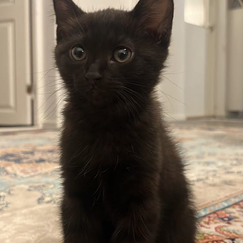 Lilla kattfröken är född 22 augusti 2025 men blev kidnappad direkt efter födseln av sin kattmamma. Mamma katt, som också är med på foto, behagade ta hem henne till oss först för några veckor sedan.